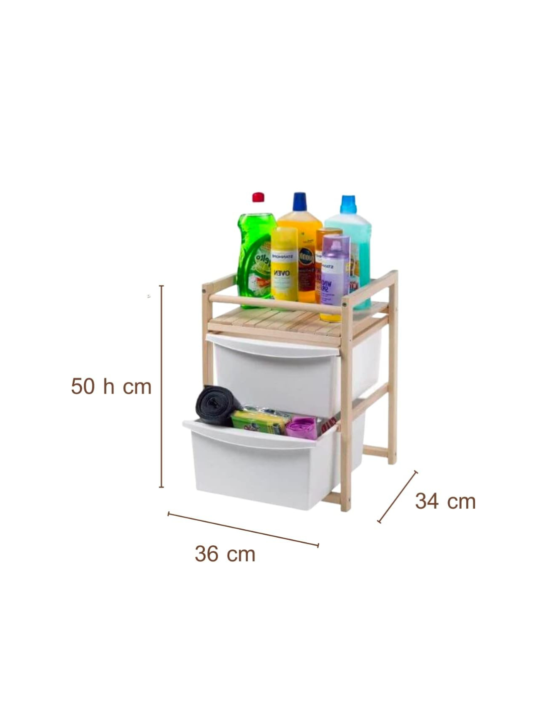 La sua struttura compatta ma capiente è dotata di 2 cassetti porta utensili e un ripiano, ideale per riporre posate, strofinacci e accessori.